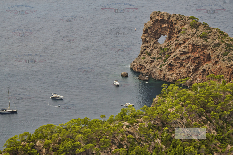 Felsen Sa Foradada Mallorca Lochfelsen Foto Bild Stockfoto. Der Felsen Sa Foradada im Tramuntana Gebirge zwischen Valldemossa und Deia. Der Felsen ist 82 Meter hoch, Der Durchmesser der Öffnung beträgt rund 14 Meter