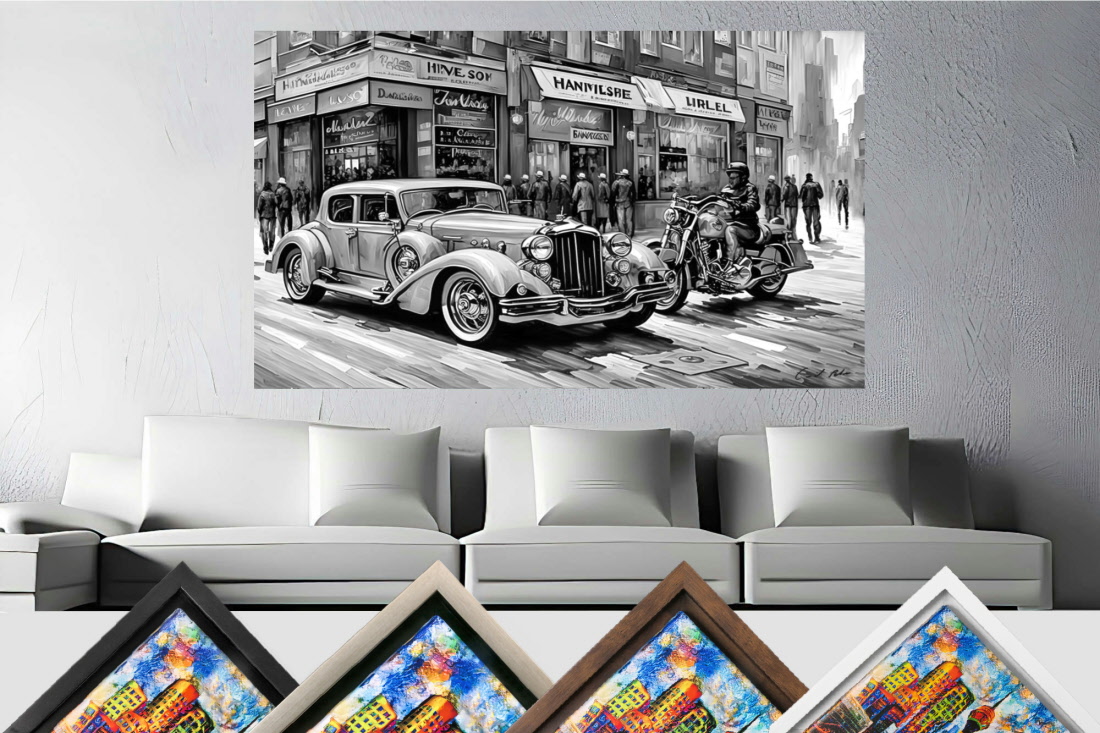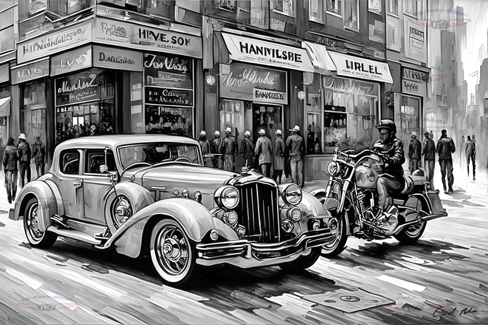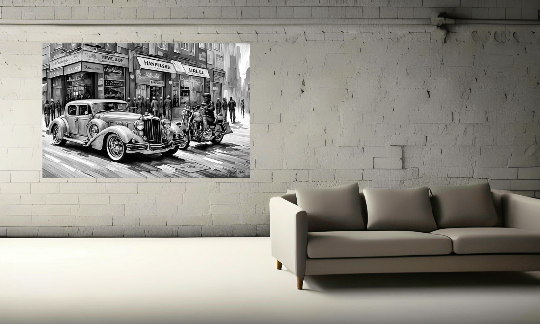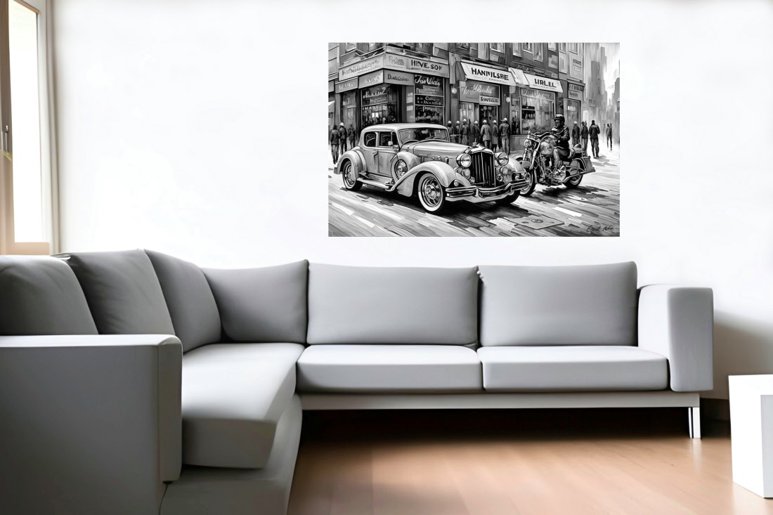 Schwarz weiß Bild USA Auto / Motorrad Oldtimer Wanddeko Wandbild Kunst